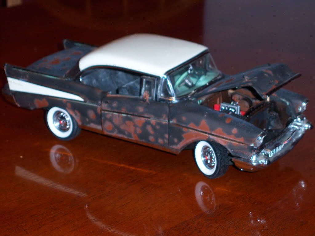 Bought this car at a flea market for $5. All metal body , original color was teal , decided to black it out and weather it up a bit . Metal is koo but plastic is better. Happy holidays.